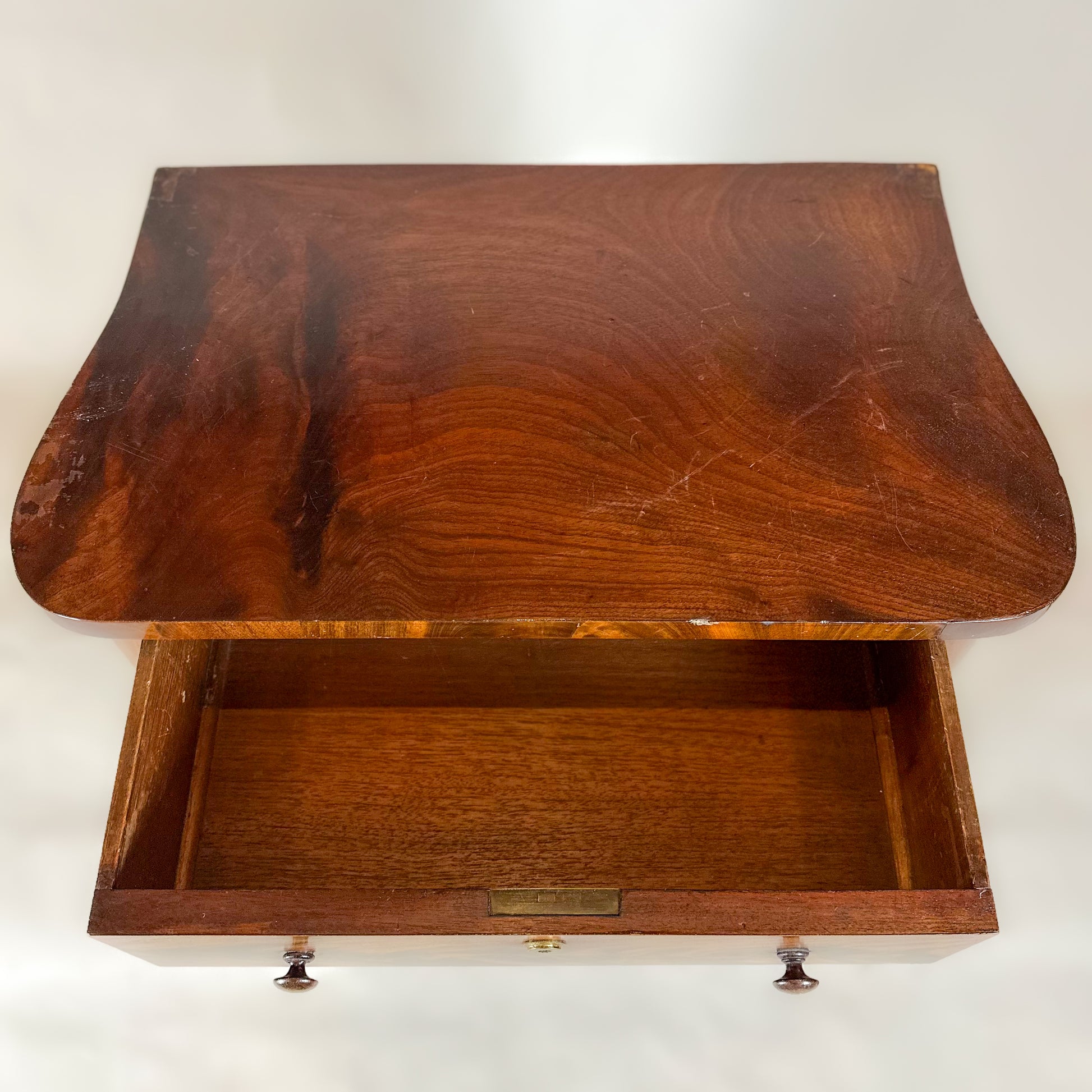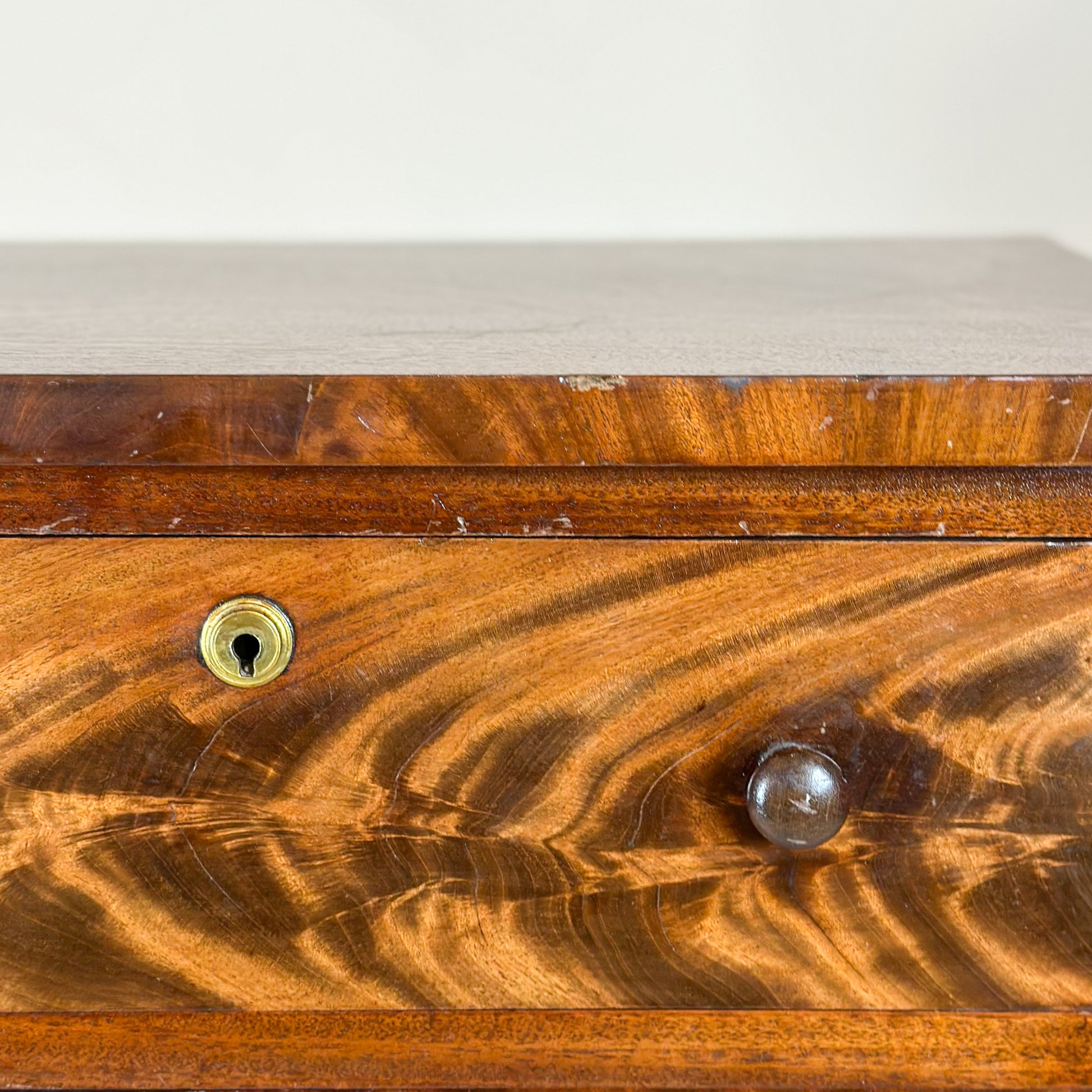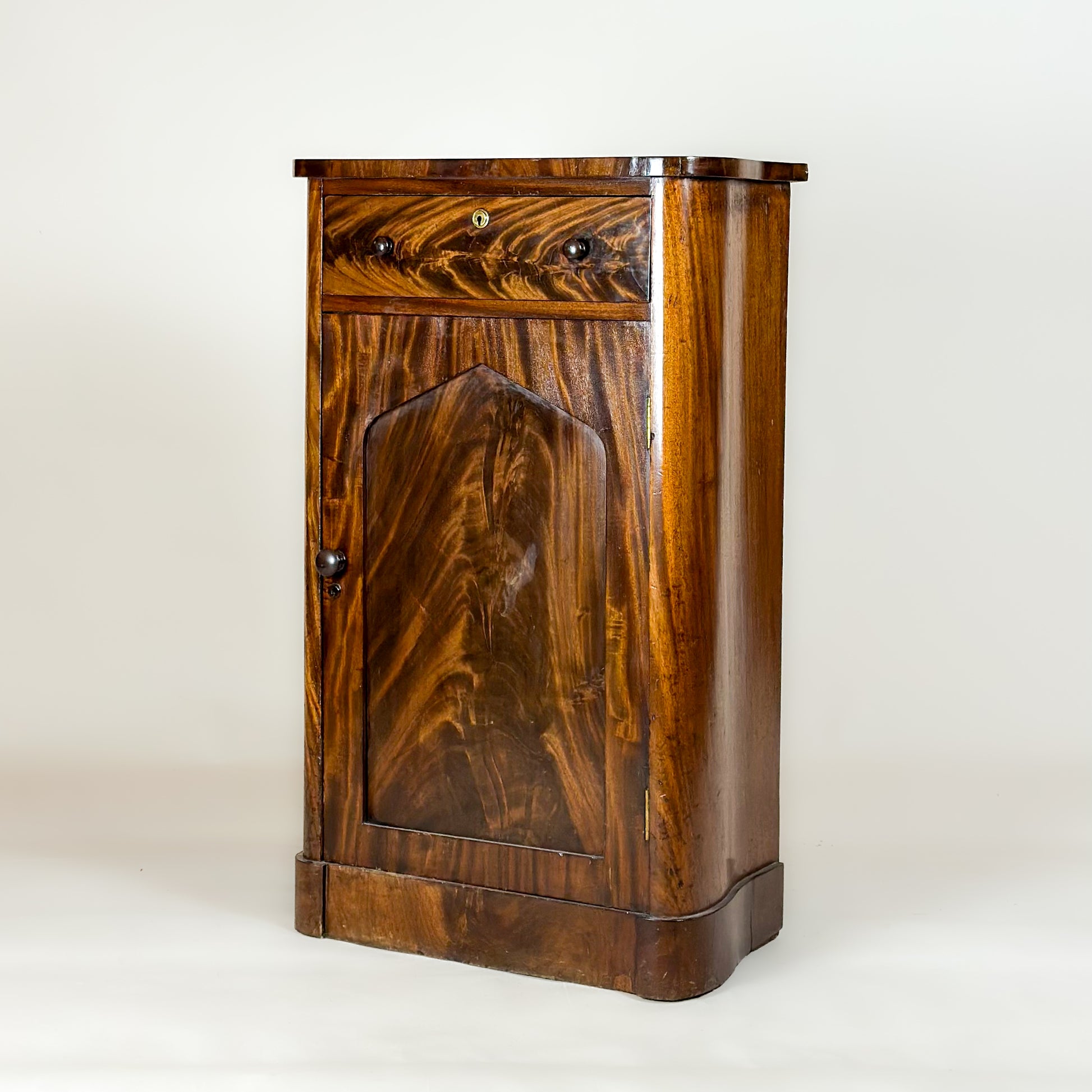 A handsome Regency flame mahogany cupboard of compact proportions, displaying superb colour and beautifully figured grain throughout. The piece features a single arched-panelled door to the front, framed by rounded stiles, and a frieze drawer above fitted with original turned mahogany knobs and a brass escutcheon. The top is neatly rounded at the front corners, and the cupboard stands on a plinth base. A classic and highly decorative example with striking veneers and an elegant architectural shape.