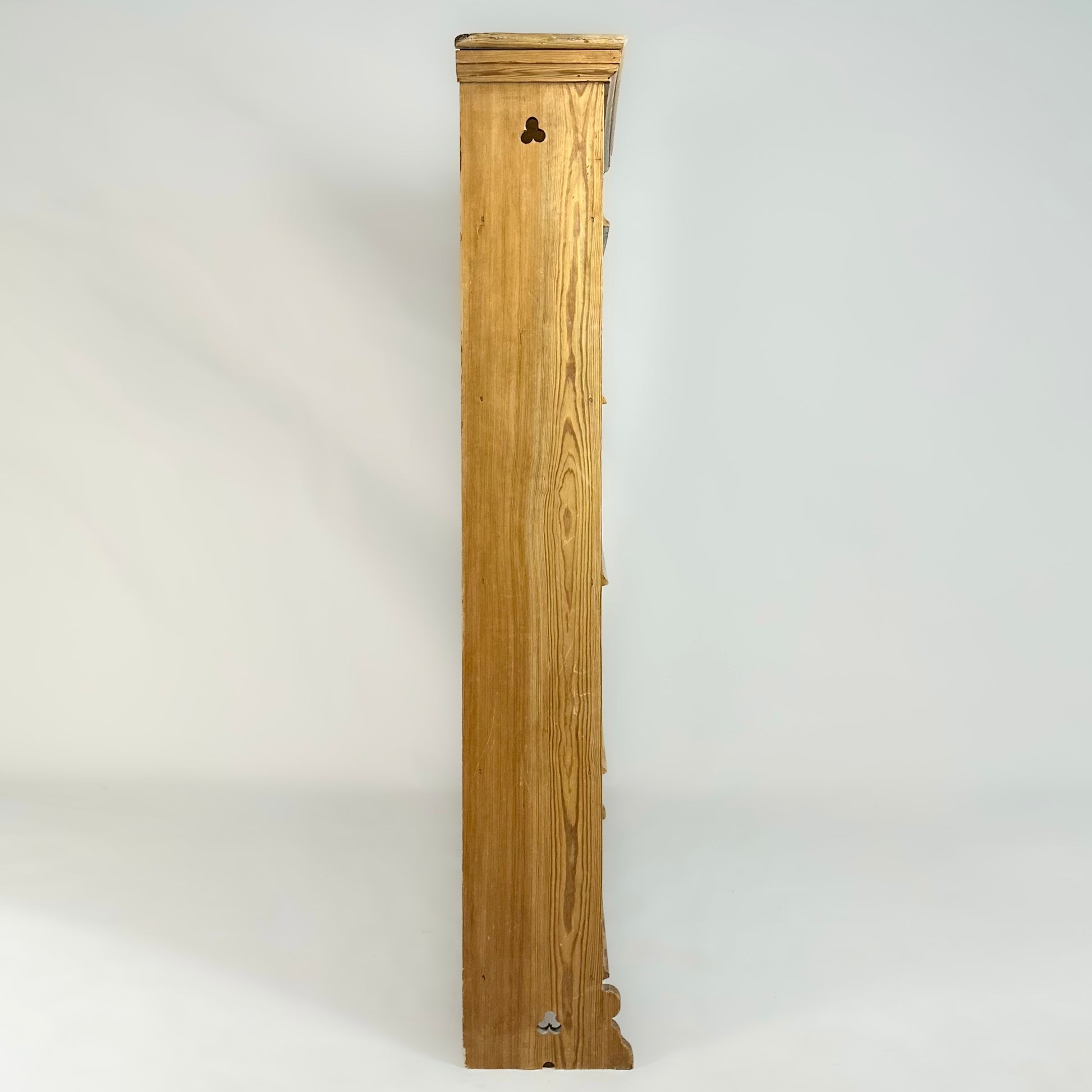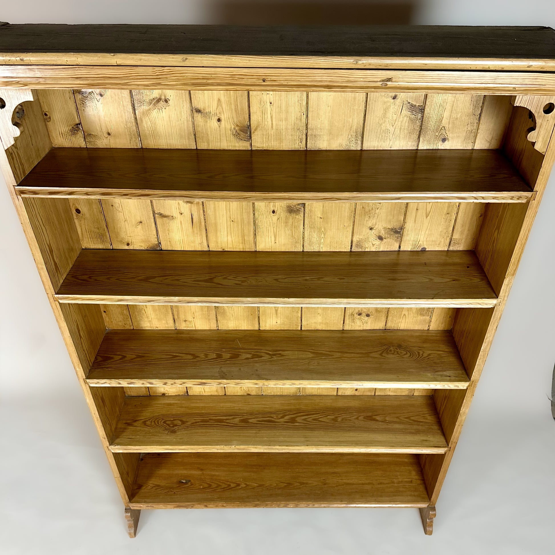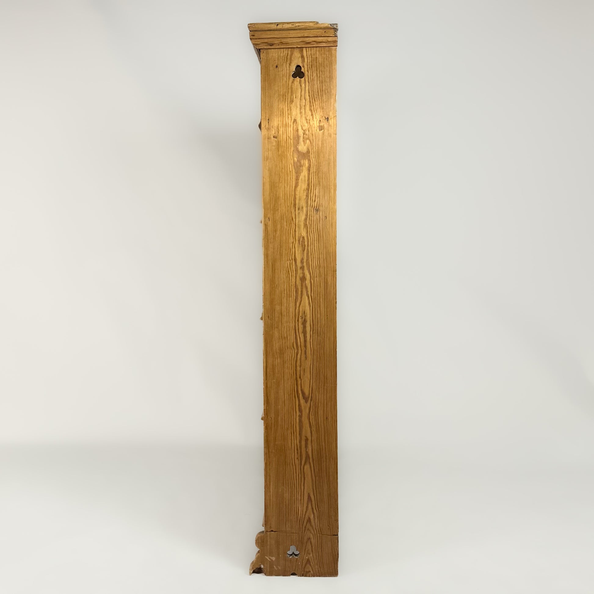 A handsome and generously sized antique pine bookcase, likely originally from a chapel vestry, retaining its original character and charm. Constructed from solid pine with a warm, honeyed patina and panelled back, this piece features five fixed shelves and a subtle gothic influence with cut-out quatrefoils to the sides and plinth.